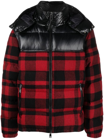 black/dark red wool blend duck down check print padded design quilted detachable hood funnel neck front two-way zip fastening front zip fastening pockets long sleeves straight hem