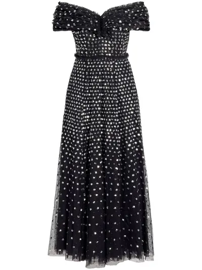 black recycled polyester tulle overlay sequin embellishment ruffled detailing gathered detailing V-neck off-shoulder rear zip fastening short draped sleeves fitted waistline A-line skirt long length straight hem