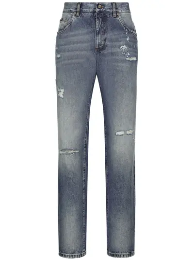 light blue cotton loose leg distressed finish whiskering effect at the thighs silver-tone logo plaque mini logo tag classic five pockets button fly fastening belt loops ankle-length