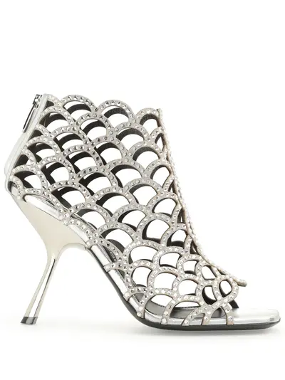 silver-tone nappa leather rhinestone rear zip fastening high stiletto heel caged design square open toe leather sole