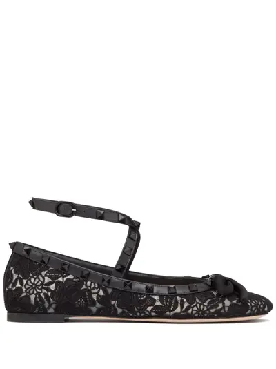 black calf leather lace embroidery signature Rockstud detailing stud detailing bow detailing round toe buckle-fastening ankle strap branded insole flat rubber sole