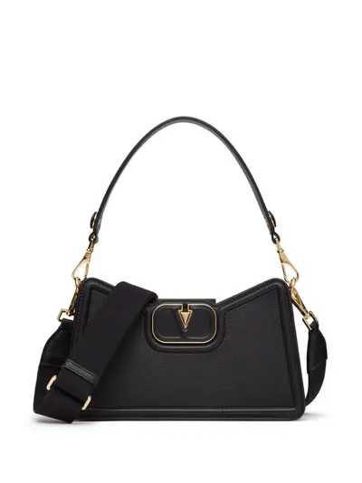 black calf leather grained texture VLogo Signature gold-tone hardware clip-lock fastening adjustable detachable shoulder strap single detachable top handle internal slip pocket leather lining