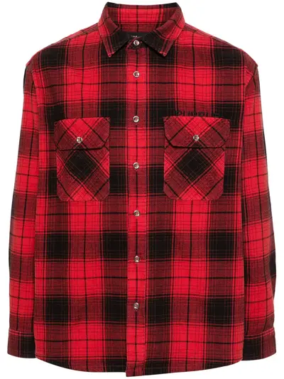 cardinal red/black cotton flannel plaid check pattern pointed flat collar front button fastening logo-engraved buttons long sleeves buttoned cuffs two chest flap pockets curved hem