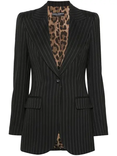 black/white virgin wool blend pinstripe pattern peak lapels shoulder pads long sleeves buttoned cuffs logo-engraved buttons fitted waistline two side flap pockets English rear vents internal logo tag contrast lining curved hem front button fastening