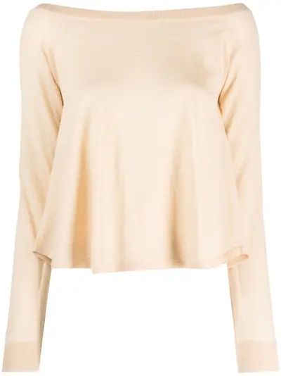 blush beige virgin wool fine knit Bardot neckline long sleeves ribbed cuffs curved hem