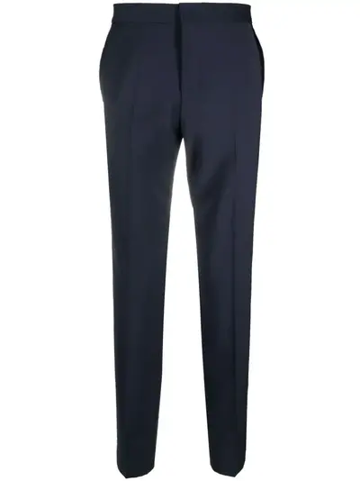 navy blue virgin wool blend concealed fly and button fastening two side inset pockets two rear jetted pockets tapered leg straight hem