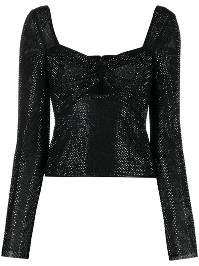 black stretch-design mesh design rhinestone embellishment twist detailing cut-out detailing sweetheart neck long sleeves straight hem cropped full lining