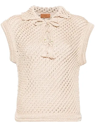 light beige cotton open knit tassel detail spread collar front tie fastening sleeveless ribbed cuffs and hem