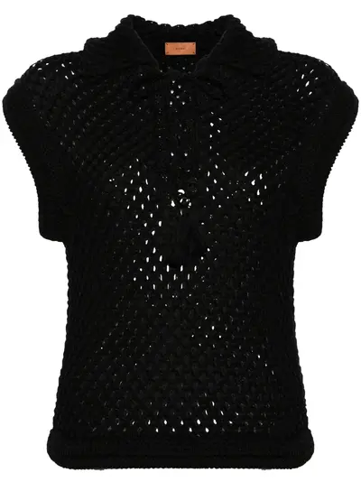 black cotton open knit tassel detail spread collar front tie fastening sleeveless ribbed cuffs and hem