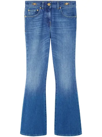 indigo blue cotton washed denim whiskering effect Medusa plaque detail mid-rise belt loops concealed fly and button fastening classic five pockets flared