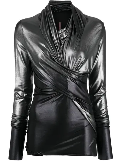 silver stretch-design metallic finish asymmetric design fully draped crossover neck long sleeves straight hem