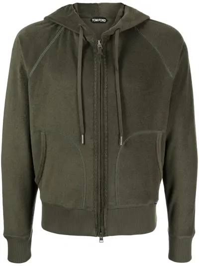 khaki cotton terry-cloth effect drawstring hood front zip fastening long raglan sleeves two front patch pockets long raglan sleeves ribbed cuffs and hem straight hem