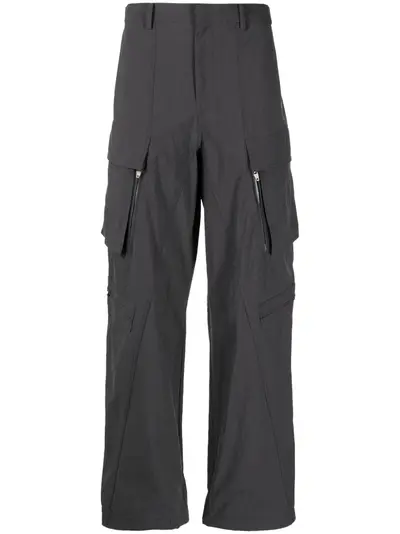 anthracite grey tonal stitching silver-tone hardware mid-rise concealed front fastening belt loops two side cargo pockets two side zip-fastening pockets two rear welt pockets wide leg straight hem