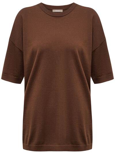 chocolate brown merino wool blend jersey texture crew neck drop shoulder short sleeves straight hem