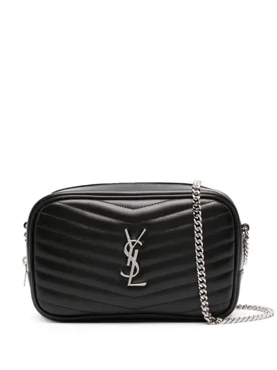 black calf leather patent finish chevron quilting silver-tone hardware signature YSL logo plaque leather and chain-link shoulder strap slip pocket to the rear top zip fastening main compartment