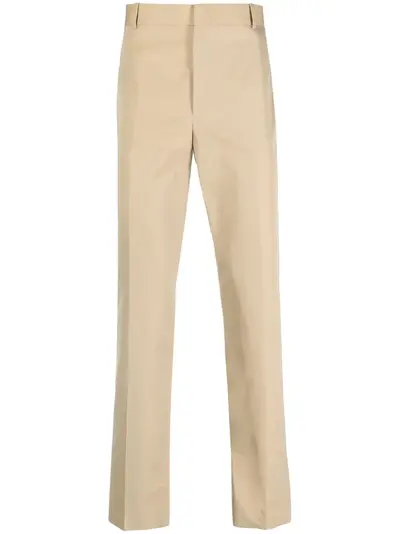 beige cotton tailored cut belt loops concealed front fastening two side slash pockets two rear button-fastening jetted pockets pressed crease