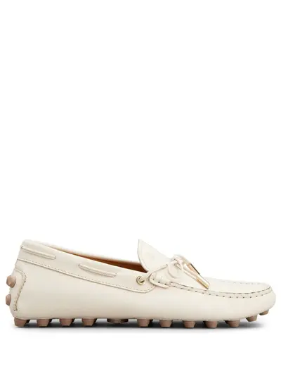 white leather smooth grain signature Gommino sole debossed logo to the front front lace-up fastening almond toe branded leather insole