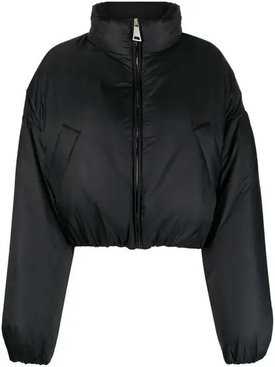 black padded design front zip fastening two front welt pockets high neck long sleeves cropped straight hem