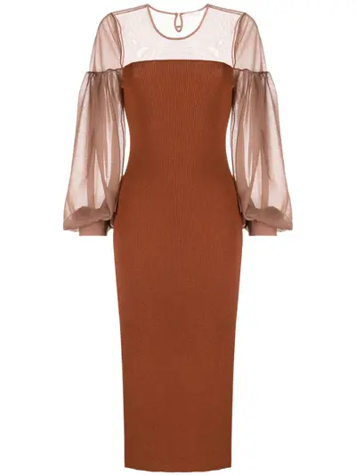 dark orange merino wool blend ribbed knit sheer panelling round neck single rear button fastening long puff sleeves rear slit straight hem below-knee length