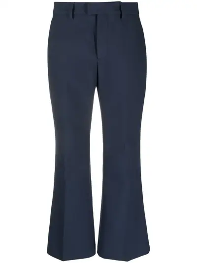 indigo blue wide leg mid-rise belt loops off-centre front fastening two side inset pockets rear jetted pocket cropped leg