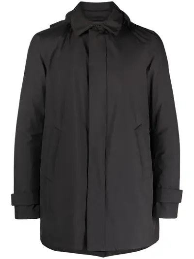dark grey feather down padded design detachable drawstring hood spread collar concealed front fastening two side slit pockets long sleeves touch-strap cuffs central rear vent straight hem