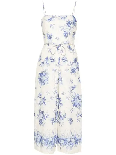 blue/cream white linen-cotton blend chambray square neck spaghetti straps all-over floral print two side inset pockets pleat detailing gold-tone logo plaque to the rear internal logo tag wide leg concealed side zip fastening