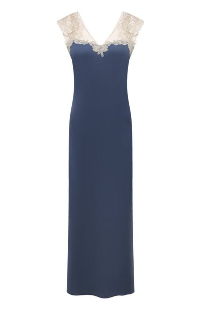 Синюю сорочку длиной в пол сшили из особенно мягкого шелковистого трикотажа на основе нежного модала, усиленного эластаном. Материал хорошо пропускает воздух и исключительно приятно ощущается на коже, помогая полноценно расслабиться после напряженного дня. Чувственность модели с V-образным вырезом добавляет вставка на лифе, выполненная из полупрозрачного цветочного кружева Leavers.