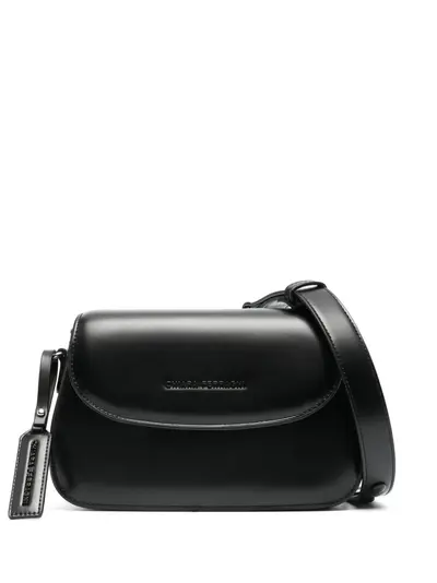 black faux leather smooth grain adjustable detachable shoulder strap logo lettering logo charm main compartment internal zip-fastening pocket internal logo patch fleece lining foldover top with magnetic fastening