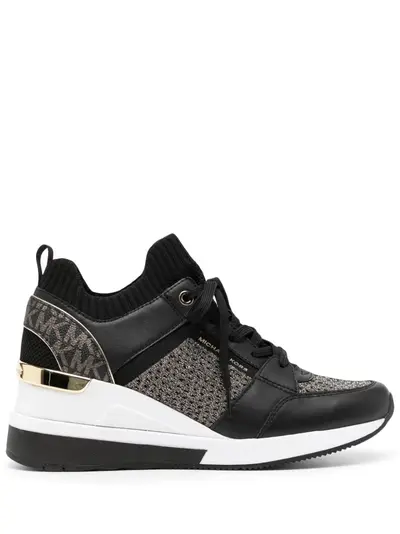 black knitted upper jacquard logo motif logo lettering round toe front lace-up fastening branded insole high wedge heel gold-tone hardware