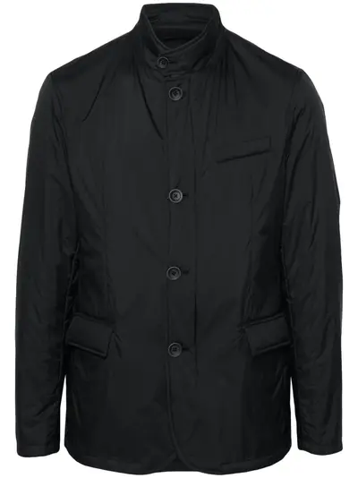 black lightweight construction padded design stand-up collar long sleeves chest welt pocket side flap pocket internal logo tag curved hem front button fastening