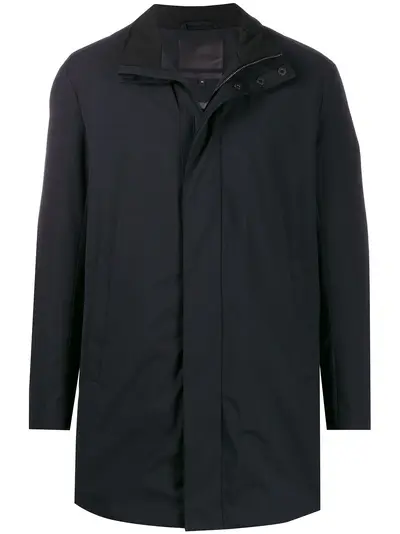 Blue contrast lining coat from Emporio Armani featuring a high standing collar, a button over front zip fastening, front welt pockets and a short length.