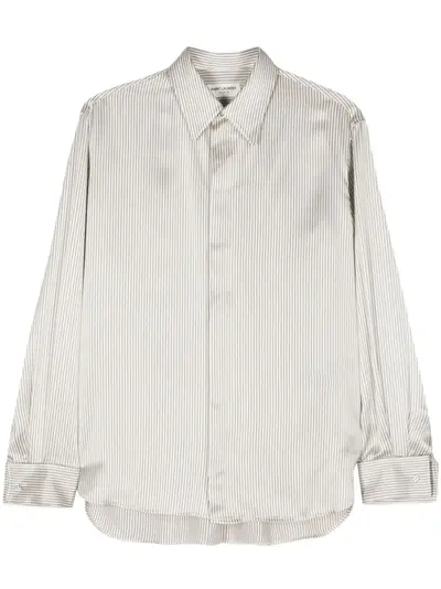 light grey silk satin finish vertical stripe pattern classic collar long sleeves buttoned cuffs hem gusset concealed front button fastening