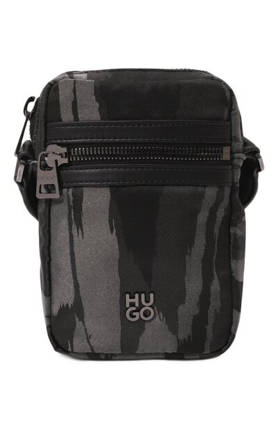 Сумку с графичным мотивом в серых тонах выполнили из прочного структурированного текстиля, отделку — из напоминающего кожу материала. Аксессуар с регулируемым плечевым ремнем, как и один из внешних карманов, застегивается молнией. Внутрь поместятся портмоне, смартфон и ключи. На принадлежность марке, основанной Хуго Фердинандом Боссом, указывает металлическая накладка спереди.