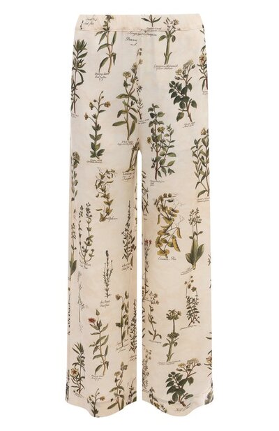 Бежевые брюки с двумя боковыми карманами мастера бренда, основанного Луиджи Коломбо, выполнили из мягкого материала с принтом, напоминающим иллюстрации из книги по ботанике. В составе соединили отборный нежный кашемир, изготовленный из пуха горных коз кашмирской породы, и прочный шелк. Их волокна сделали изделие особенно приятным на ощупь.