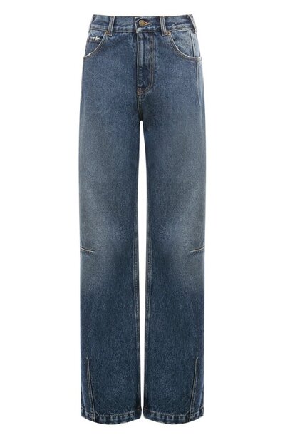 Синие расклешенные джинсы с завышенной посадкой и защипами под поясом, в области колен и на низе выполнили из мягкой хлопковой ткани. Модель комфортно садится по фигуре и поддерживает оптимальный микроклимат. Небольшие потертости и неоднородный выбеленный оттенок формируют иллюзию, что брюки носили не один сезон.