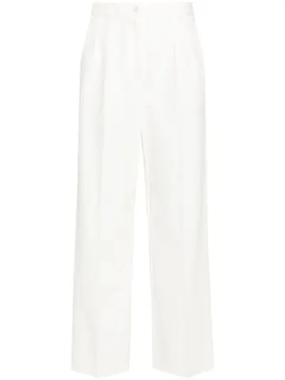 white cotton denim pleat detailing belt loops front button and zip fastening wide leg classic five pockets straight hem long length
