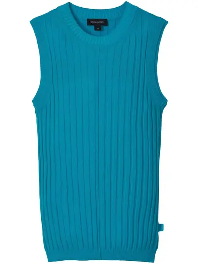 pacific blue wool fine ribbed mini logo tag crew neck sleeveless ribbed cuffs and hem straight hem