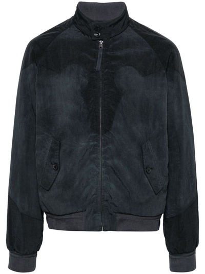 navy blue crinkled finish band collar long sleeves two front button-fastening jetted pockets signature four-stitch logo ribbed cuffs and hem internal slip pocket full lining front button and zip fastening