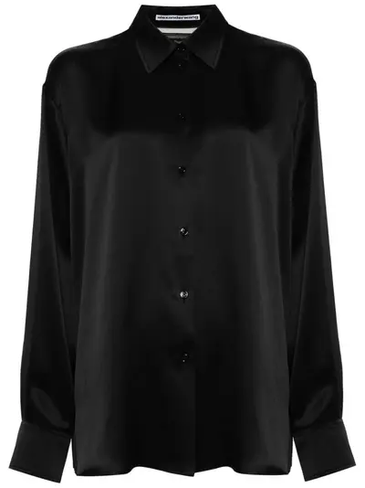 black silk charmeuse embroidered logo to the front tulle panel spread collar front button fastening long sleeves buttoned cuffs straight hem