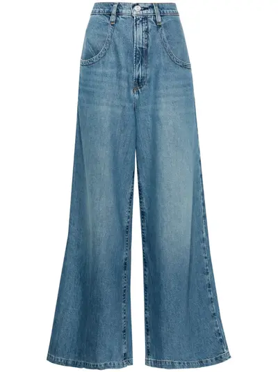 indigo blue cotton washed denim high-rise belt loops front button and zip fastening wide leg two side inset pockets two rear patch pockets straight hem long length