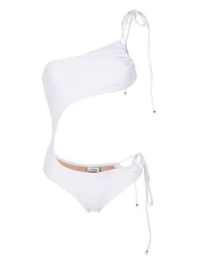 white stretch-design cut-out detailing one-shoulder rear hook fastening tie-fastening straps open back Be mindful to try on swimwear over your own garments.