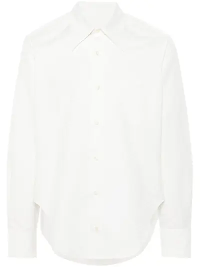 white jacquard logo motif pointed flat collar chest patch pocket long sleeves pleat detailing buttoned cuffs inverted pleat curved hem front button placket