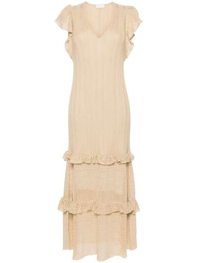 light beige/gold-tone stretch-design ribbed knit pointelle knit open knit lurex detailing ruffled detailing V-neck short sleeves tiered flared skirt long length straight hem unlined