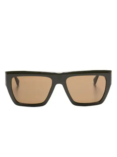 olive green acetate geometric frame brown tinted lenses logo plaque at the arm sculpted arms and curved tips These glasses come with a protective case.