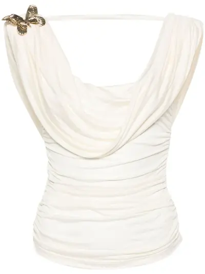 almond beige satin weave cowl neck sleeveless butterfly detail at the shoulder draped and gathered detailing curved hem