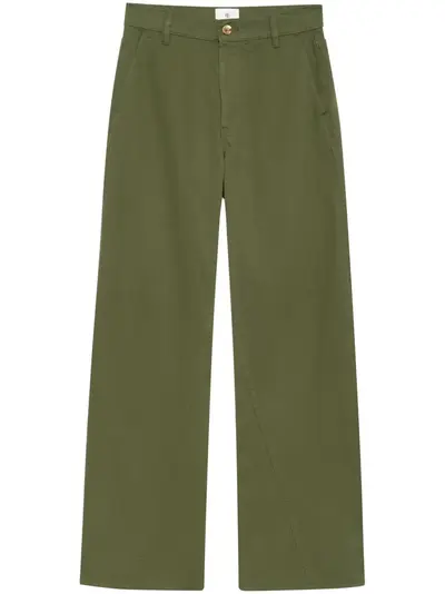 olive green cotton twill weave high-rise belt loops front button and zip fastening embossed gold-tone buttons slip pockets to the sides two rear patch pockets wide leg curved corners full-length