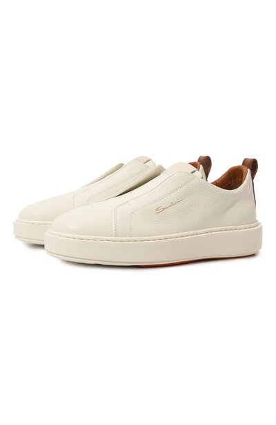 Джузеппе Сантони выбрал для пошива белых кедов мягкую прочную кожу с крупным зернением. Цветовой акцент лаконичной паре без шнуровки добавила коричневая накладка с петлей на заднике. Модель с золотистым логотипом по бокам поставили на широкую гибкую подошву с глубоким противоскользящим протектором.