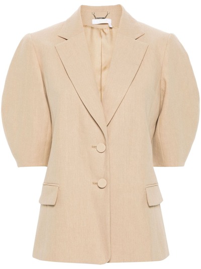 sand beige linen/flax canvas slub texture dart detailing fabric-covered buttons notched lapels front button fastening shoulder pads half-length balloon sleeves two front flap pockets American rear vent silk lining straight hem