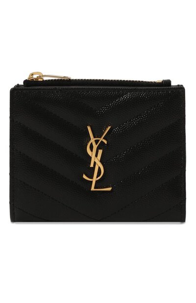 Аксессуары марки легко узнать по монограмме Кассандра, составленной из инициалов Ива Сен-Лорана. Есть такой крупный золотистый аграф и на этом черном портмоне из мягкой зерненой кожи со стеганым шевронным мотивом. Модель с четырьмя слотами для кредитных карт и отделением для банкнот дополнили карманом на молнии, в котором удобно хранить монеты.
