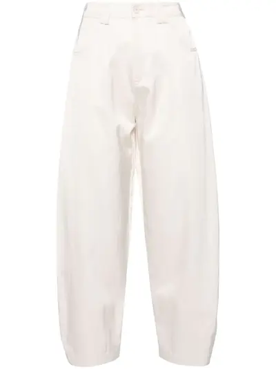 light beige lightweight construction satin finish high-rise zip fly fastening front button fastening logo-debossed buttons two side slash pockets two rear patch pockets flared